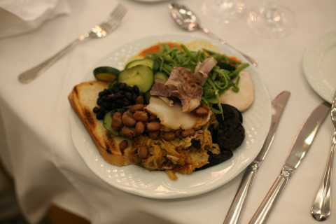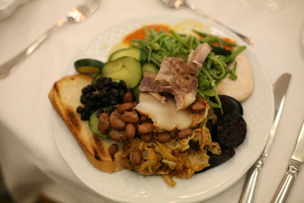 The cocido consists of a Spanish stew whose main ingredient is the chick-peas, although you can include different legumes and beans. It also contents vegetables, diverse meats and pork bacon with some inlay. Its origin is humble and was consumed initially by lower classes, reaching the high society in the last 30 years due to its inclusion in the menus of the restaurants.