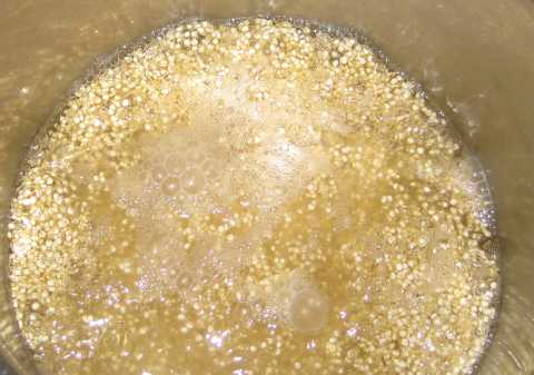 Grain is cooked like rice, i.e. three measures of water to one part quinoa. It has to be cleaned and washed thoroughly with water before cooking, not only to remove dust and small stones but specially to eliminate the saponins, which are inedible. The best way to cook the quinoa is to bring plain water to boil and then add the quinoa. Reduce heat to a minimum and cover the pan, waiting between 12 and 15 minutes. It is preferable to add the salt when it is finished cooking.