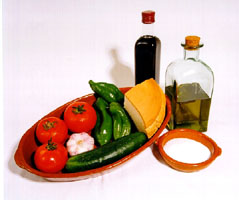Put the bread which has been previously soaked in water and drained into a stainless steel dish. Clean the peppers, the cucumbers and the tomatoes. Peel the onion and keep it for the garnish. Remove the pepper seeds, cut them into medium size pieces, except the ones to be used for the garnish. Peel the cucumbers and slice them all except the ones to be used for the garnish. Keep aside the tomato for the garnish and cut the rest into pieces. Add the tomatoes to the bread, the peppers and the previously prepared cucumber. Add the garlic which has already been peeled, and the salt, oil and vinegar. Mix well. Add a bit of water and liquidize in a mixer. Put it through a strainer adding water every once in a while. Add seasoning and allow to cool.